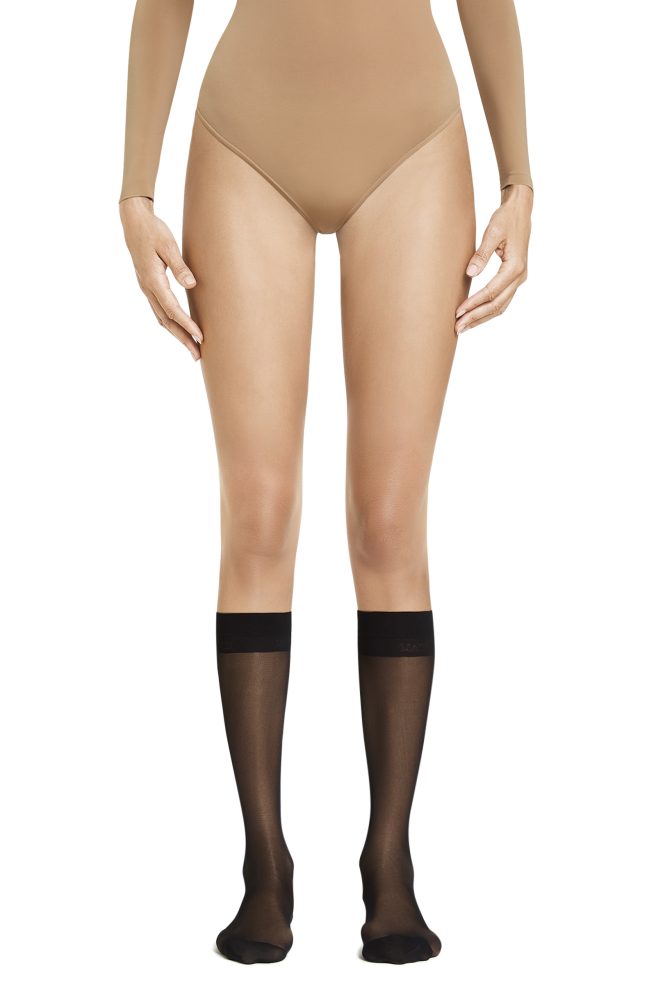 20 den, double covered, tone-on-tone, fully boarded. Logo knitted on the toe. Made in Italy.