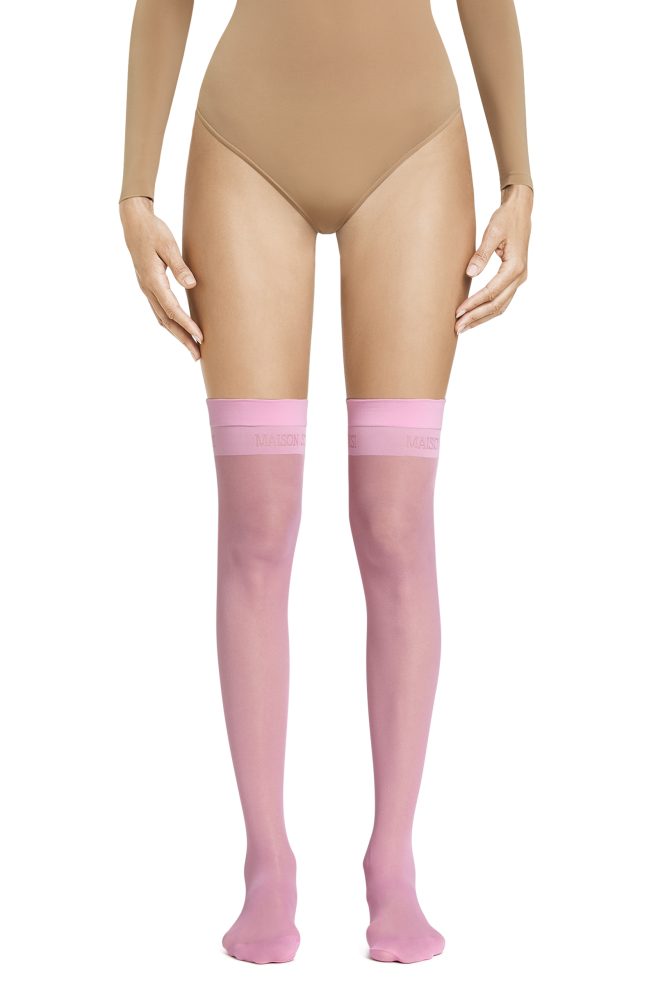 30 den, double-covered, tone-on-tone, fully boarded. Logo is knitted beneath the top band, finished with a single-layer anti-skid silicone band. Made in Italy.
