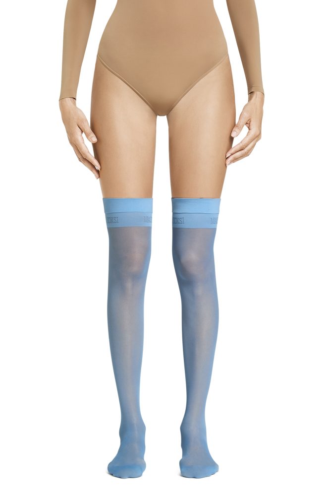 30 den, double-covered, tone-on-tone, fully boarded. Logo is knitted beneath the top band, finished with a single-layer anti-skid silicone band. Made in Italy.