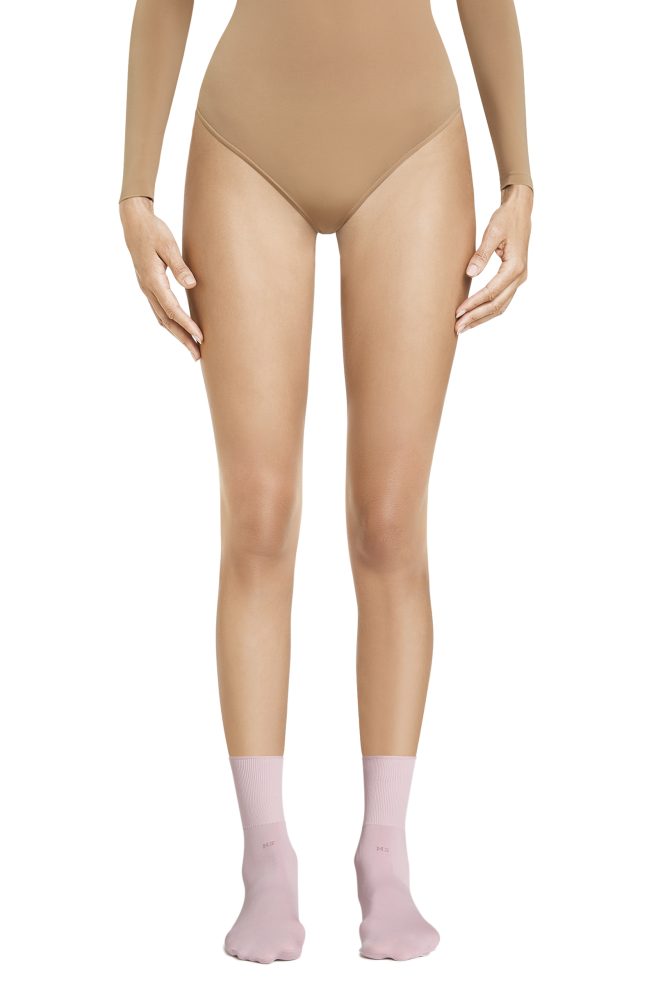 60 den, 3D, boarded, high top elastic. Logo knitted in the back under the elastic. Made in Italy.