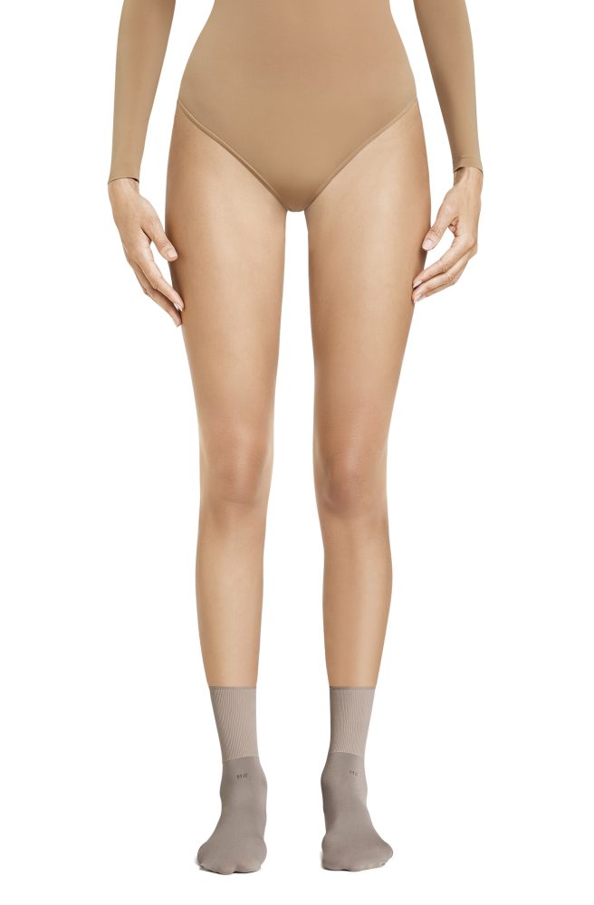 60 den, 3D, boarded, high top elastic. Logo knitted in the back under the elastic. Made in Italy.