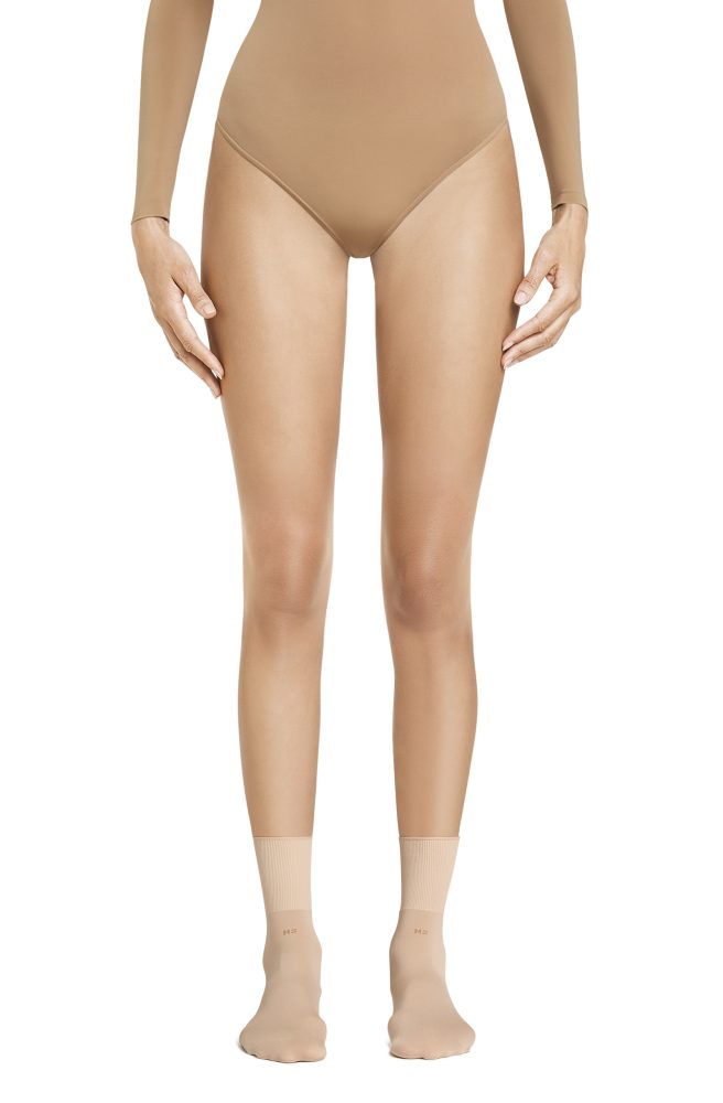 60 den, 3D, boarded, high top elastic. Logo knitted in the back under the elastic. Made in Italy.
