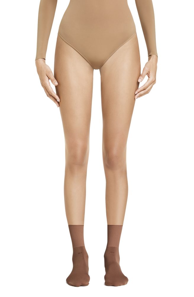 60 den, 3D, boarded, high top elastic. Logo knitted in the back under the elastic. Made in Italy.