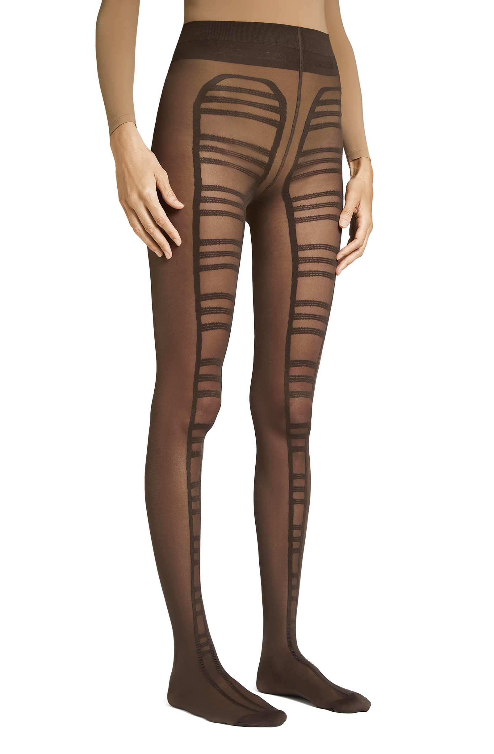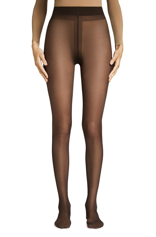 20 den, double covered, tone-on-tone, flat seam, no gusset, fully boarded. Logo knitted under the elasticized waistband. Made in Italy.