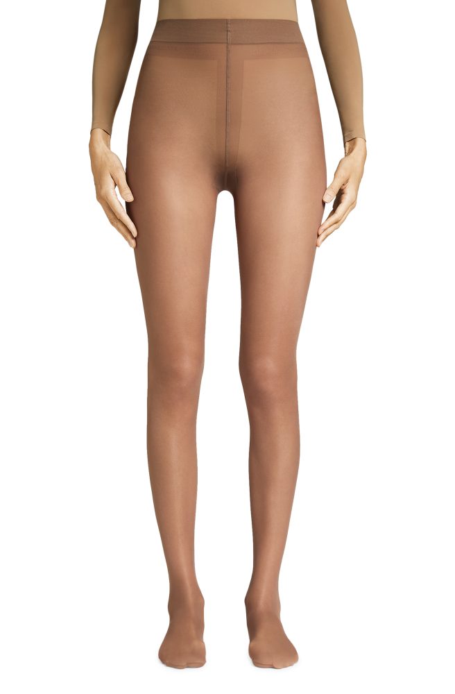 20 den, double covered, tone-on-tone, flat seam, no gusset, fully boarded. Logo knitted under the elasticized waistband. Made in Italy.
