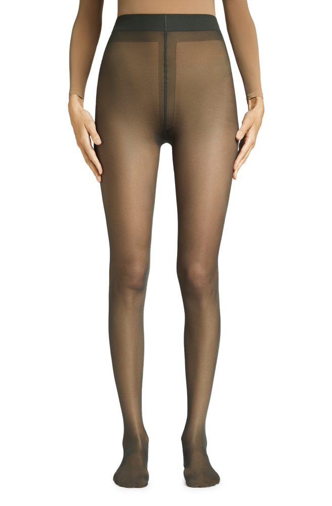 20 den, double covered, tone-on-tone, flat seam, no gusset, fully boarded. Logo knitted under the elasticized waistband. Made in Italy.