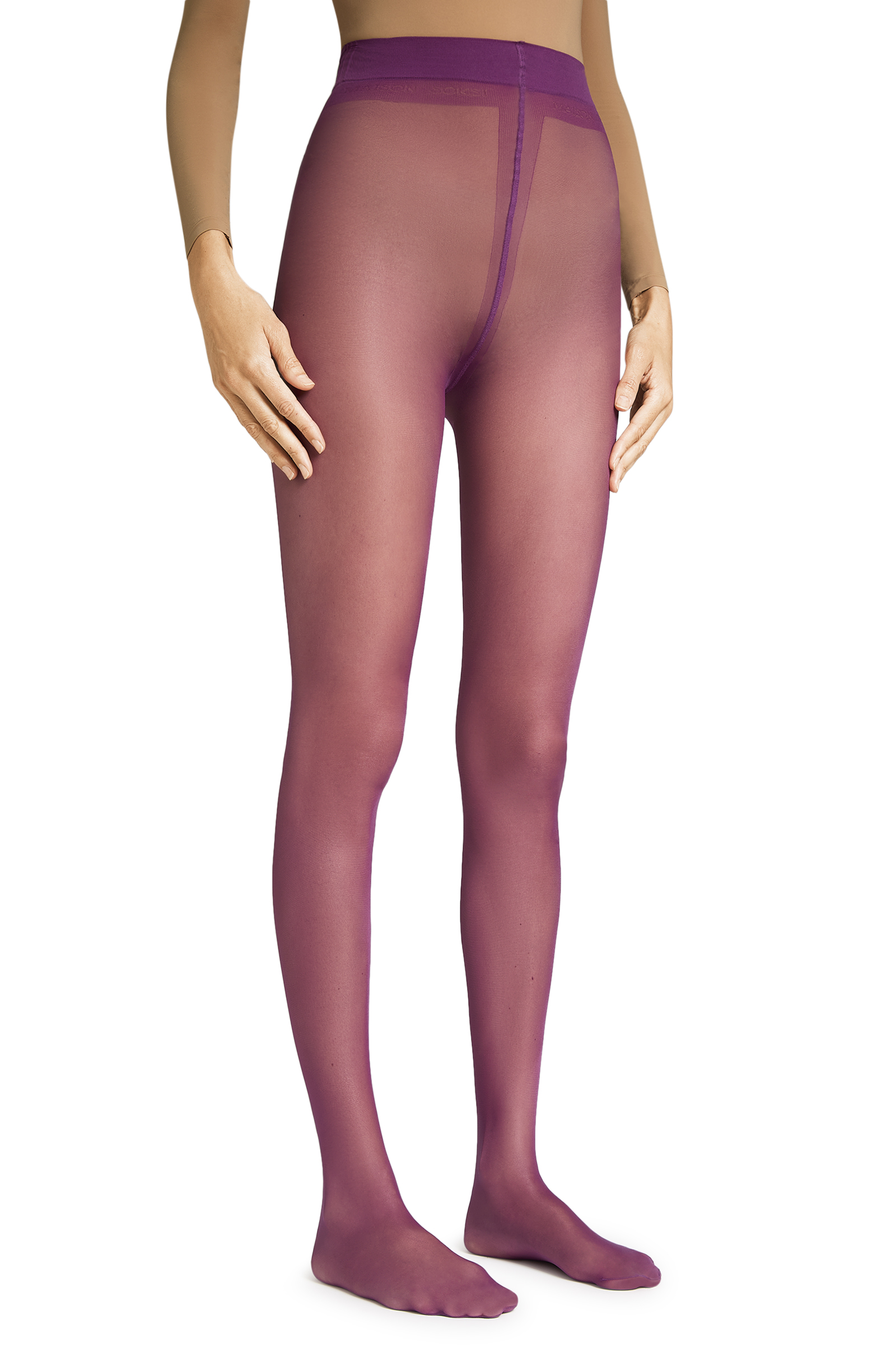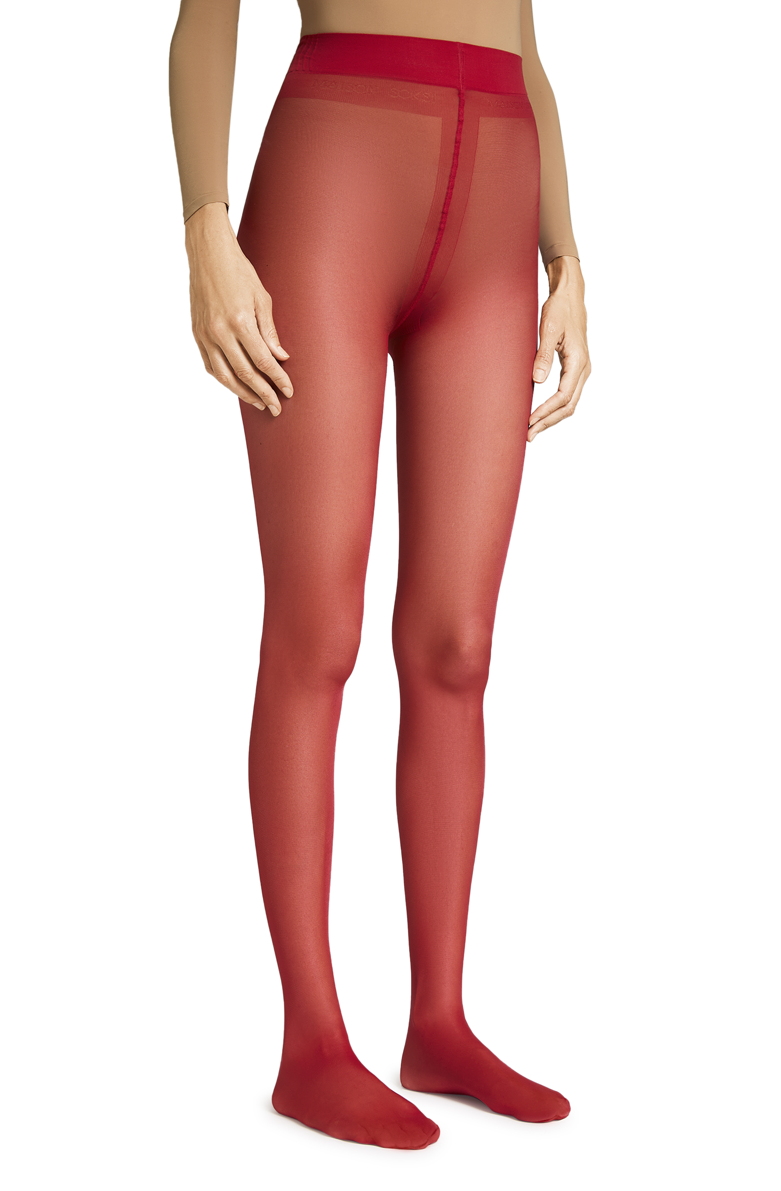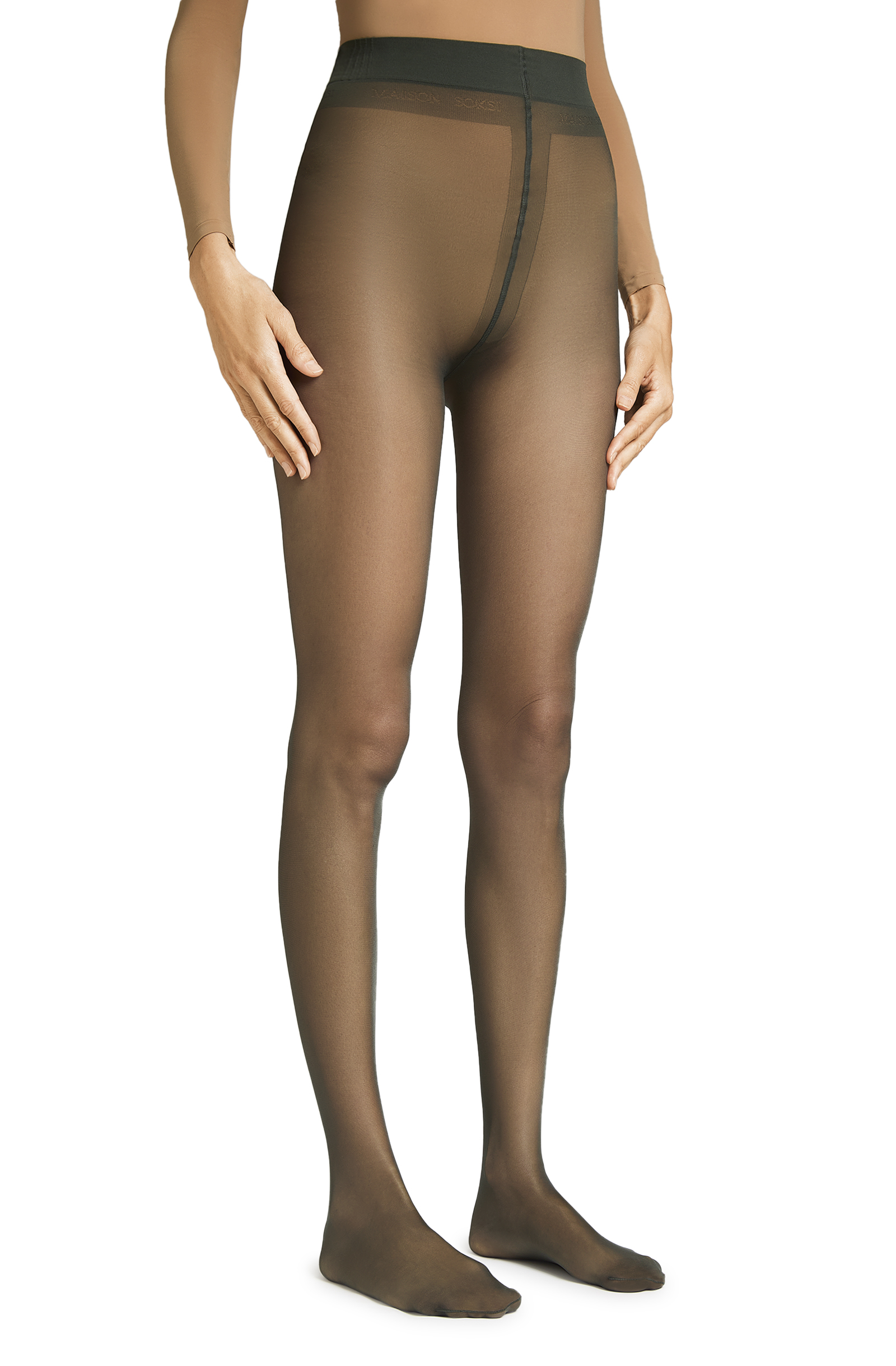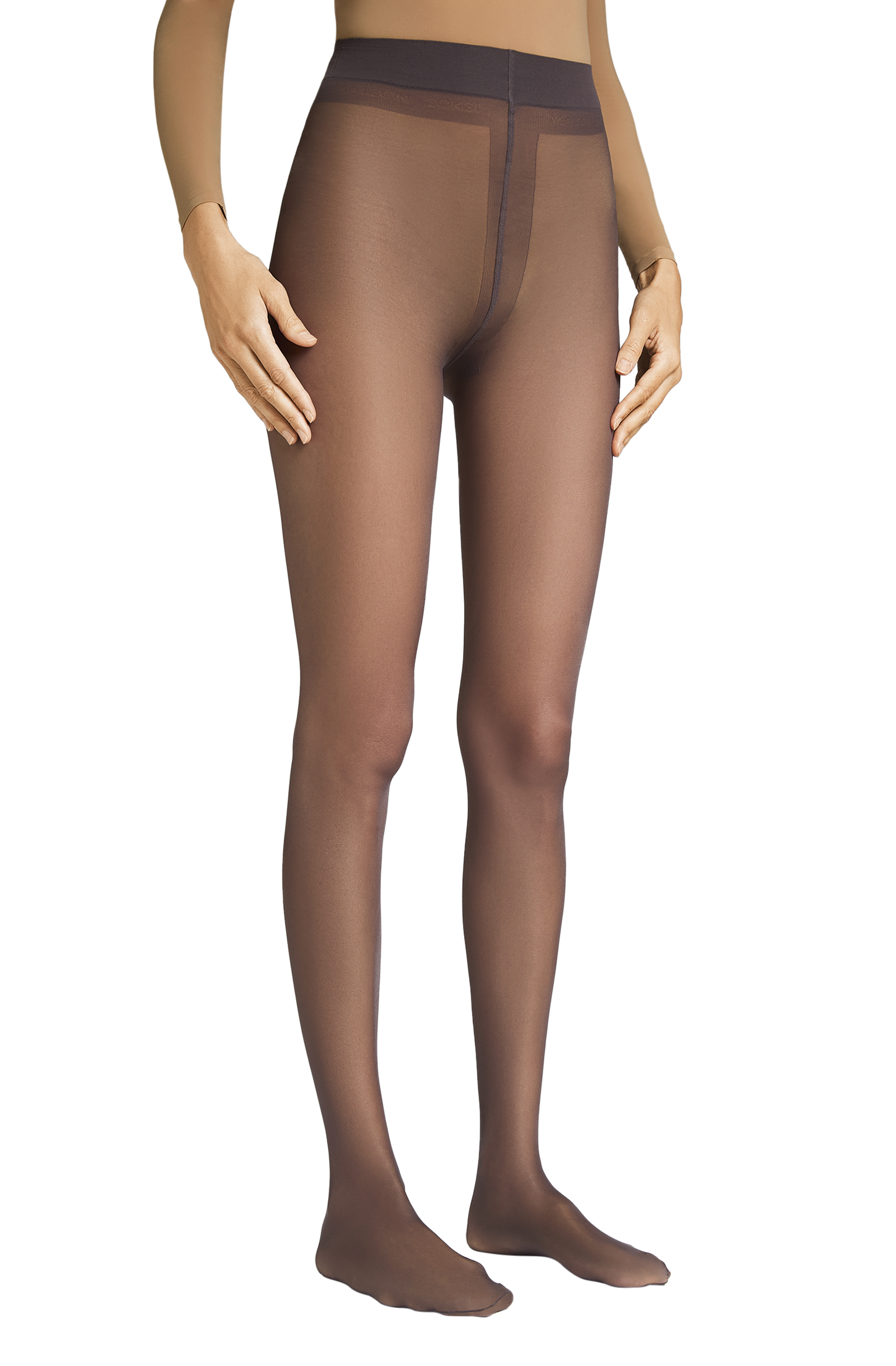 20 den, double covered, tone-on-tone, flat seam, no gusset, fully boarded. Logo knitted under the elasticized waistband. Made in Italy.
