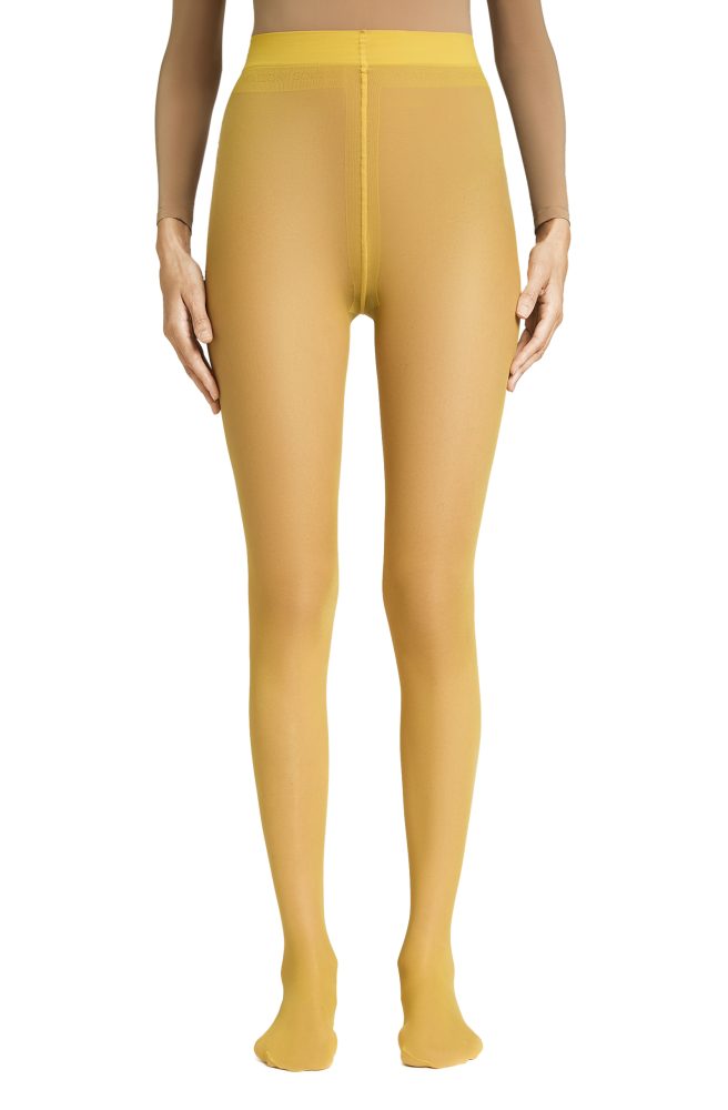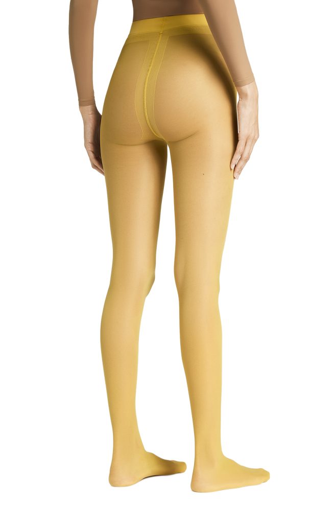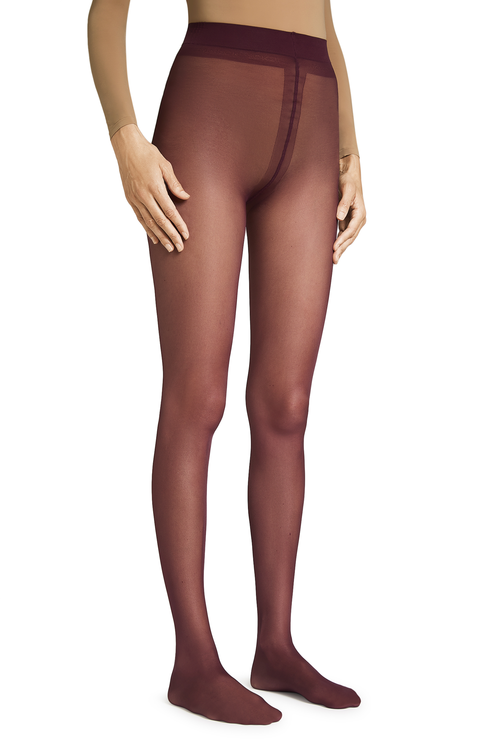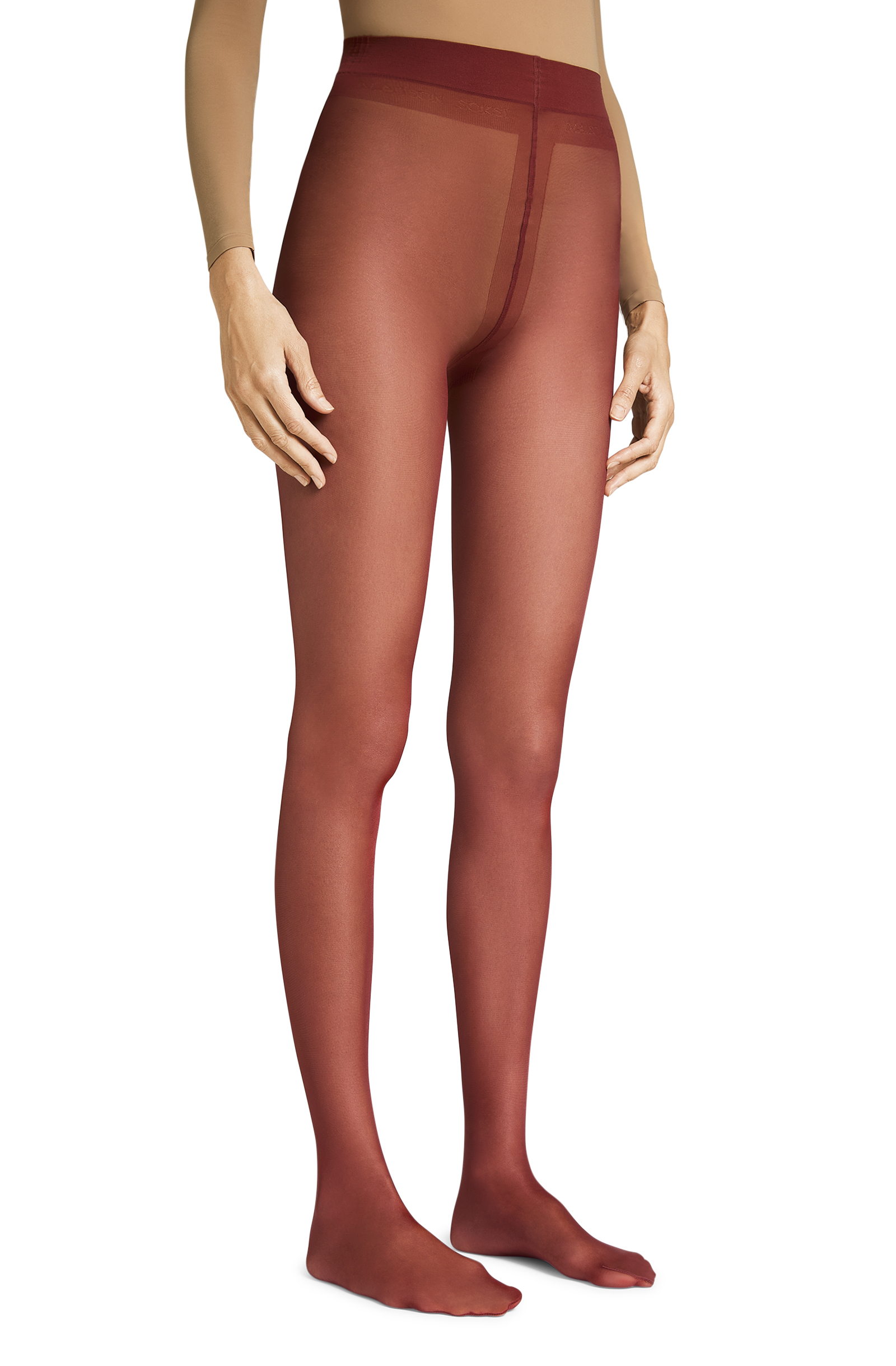 20 den, double covered, tone-on-tone, flat seam, no gusset, fully boarded. Logo knitted under the elasticized waistband. Made in Italy.