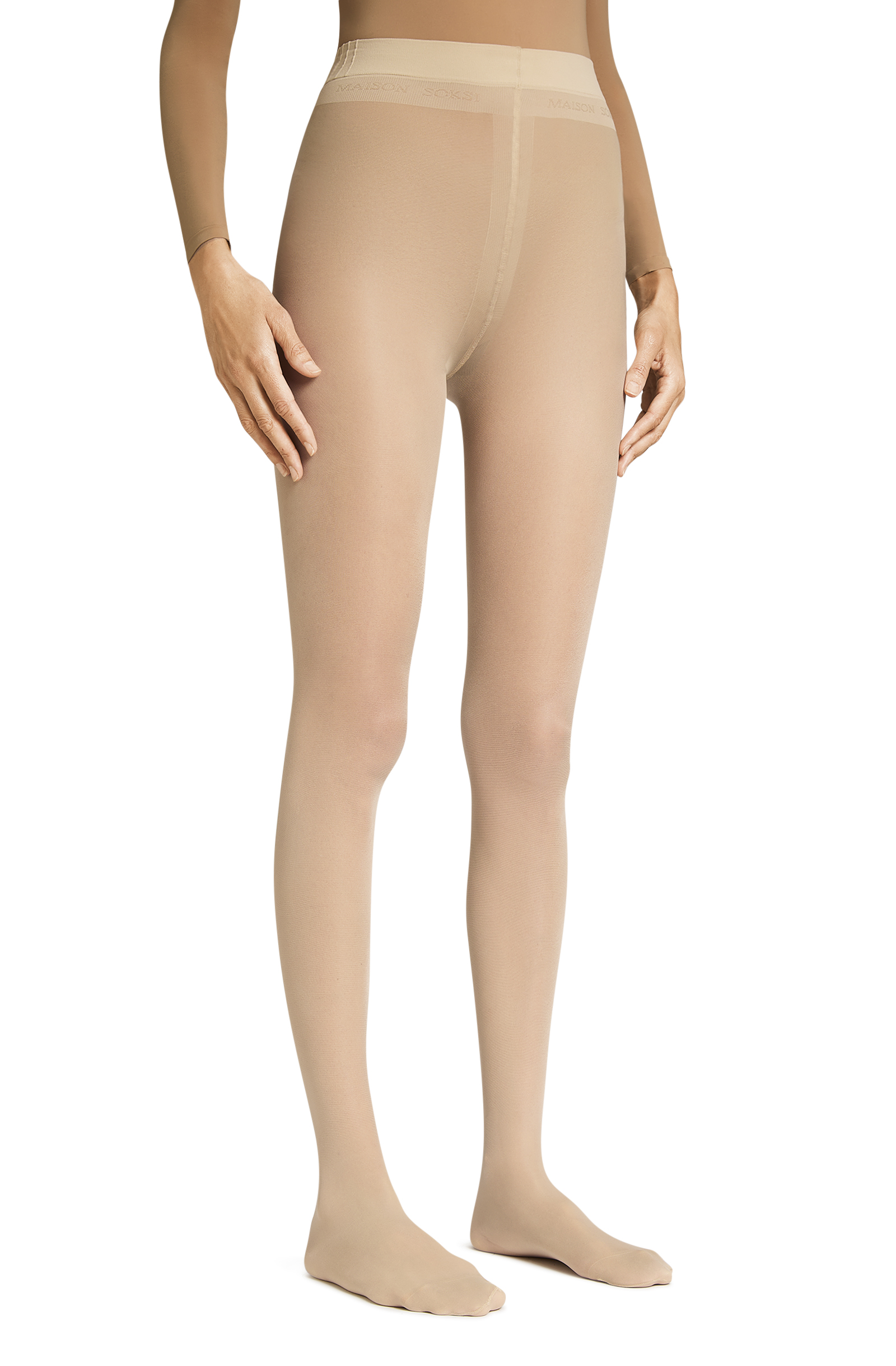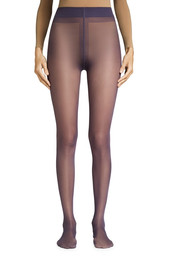 20 den, double covered, tone-on-tone, flat seam, no gusset, fully boarded. Logo knitted under the elasticized waistband. Made in Italy.