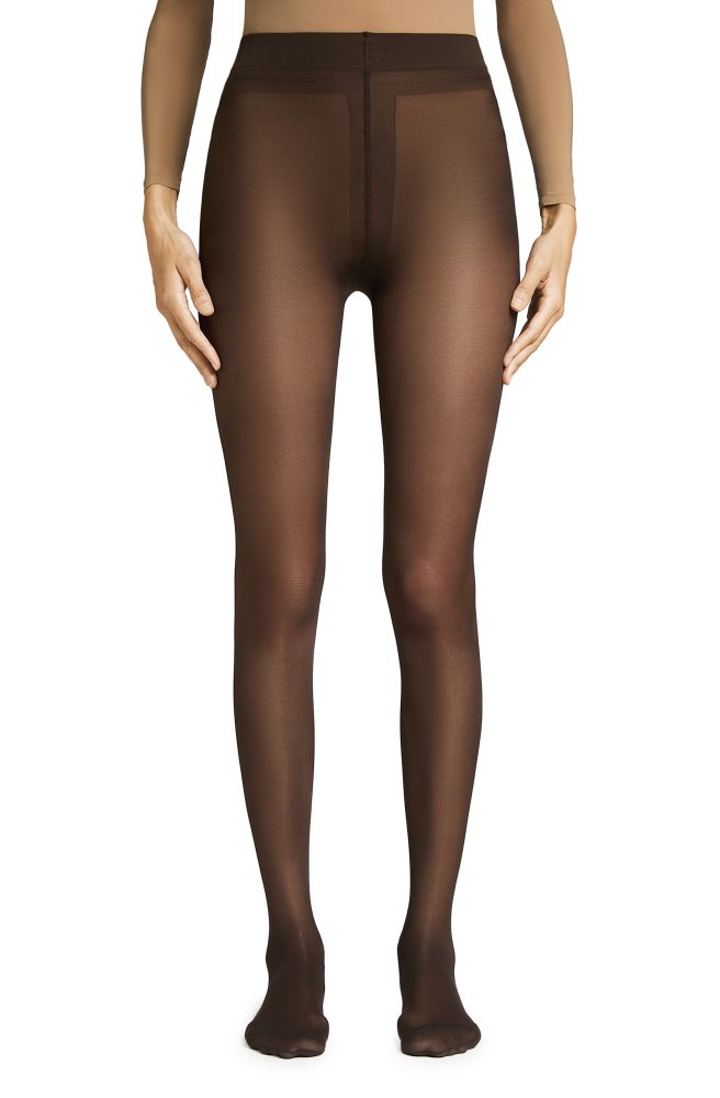 30 den, double covered, tone-on-tone, flat seam, no gusset, fully boarded. Logo knitted under the elasticized waistband. Made in Italy.