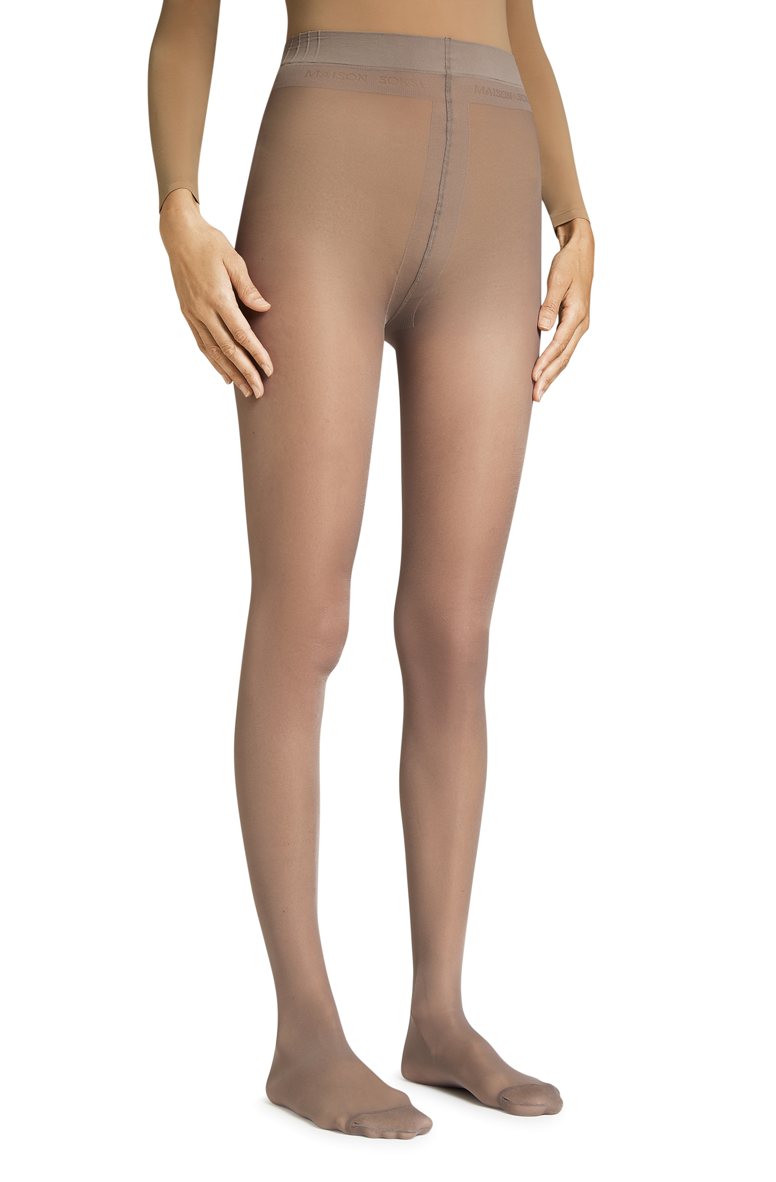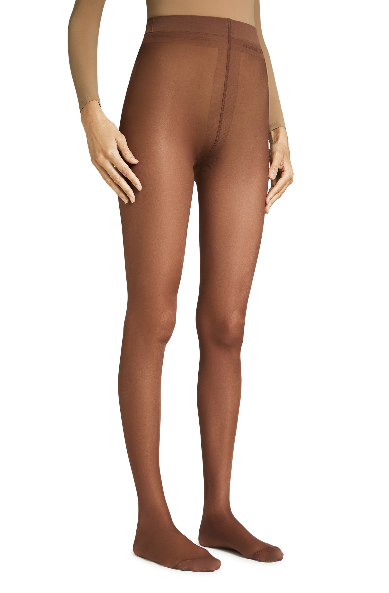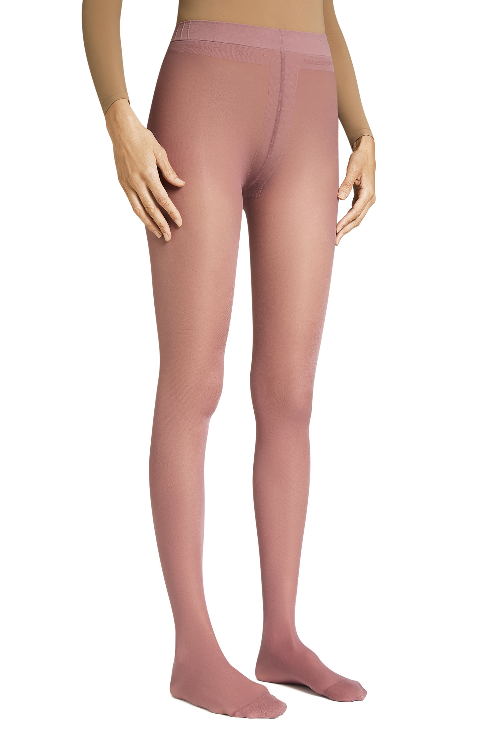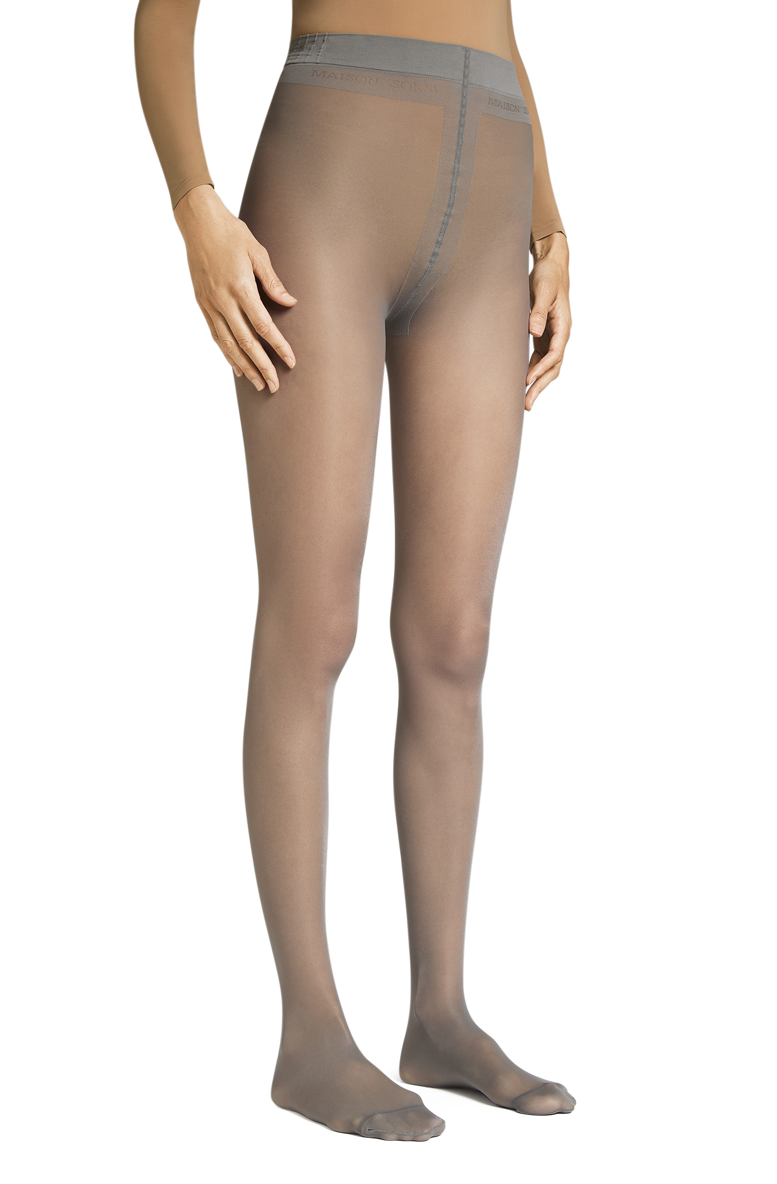 30 den, double covered, tone-on-tone, flat seam, no gusset, fully boarded. Logo knitted under the elasticized waistband. Made in Italy.
