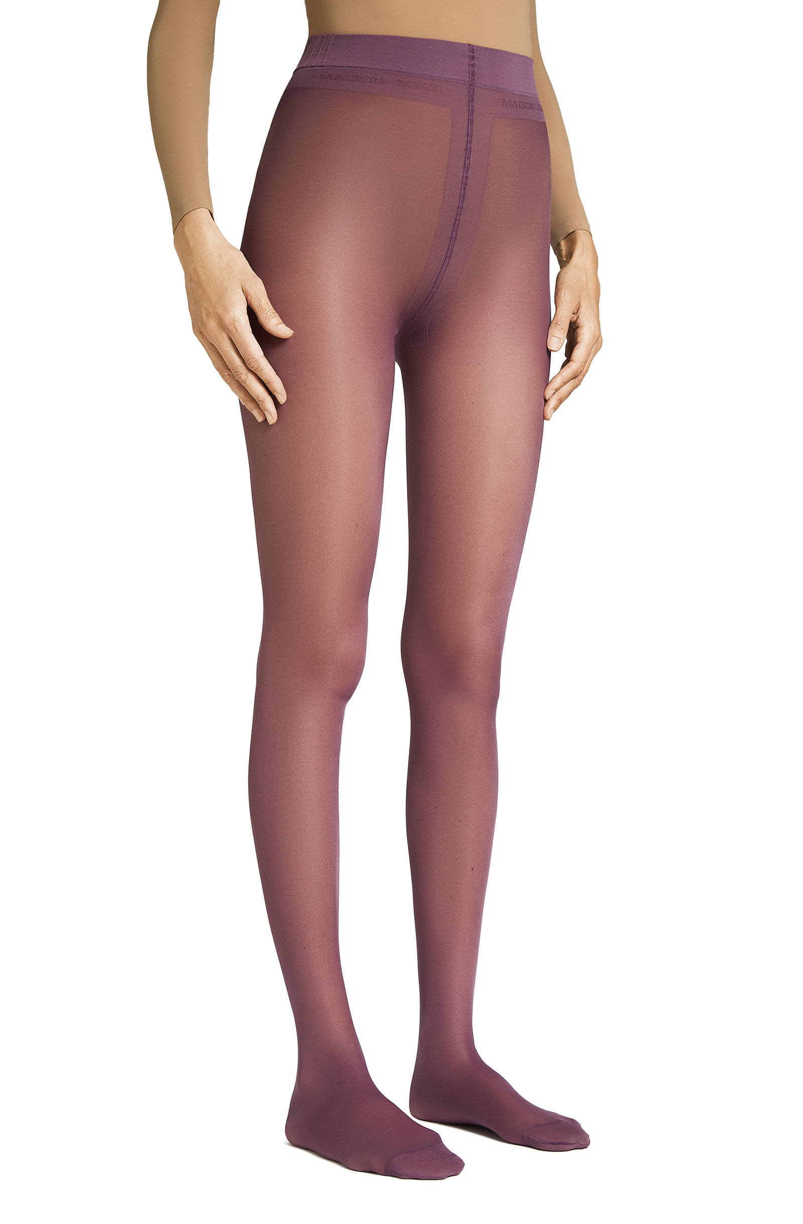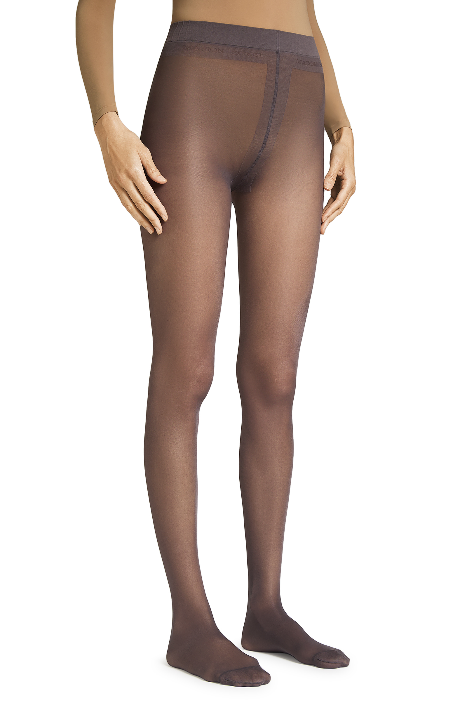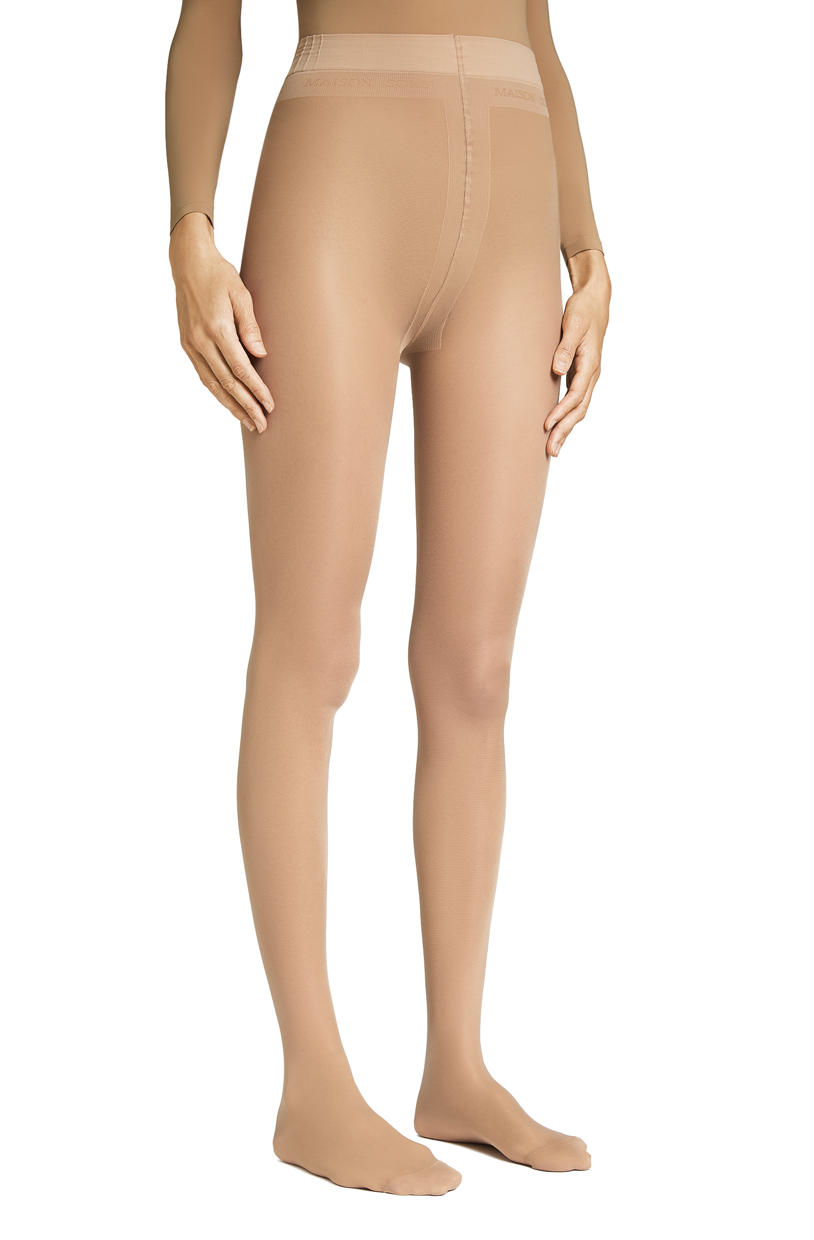 30 den, double covered, tone-on-tone, flat seam, no gusset, fully boarded. Logo knitted under the elasticized waistband. Made in Italy.
