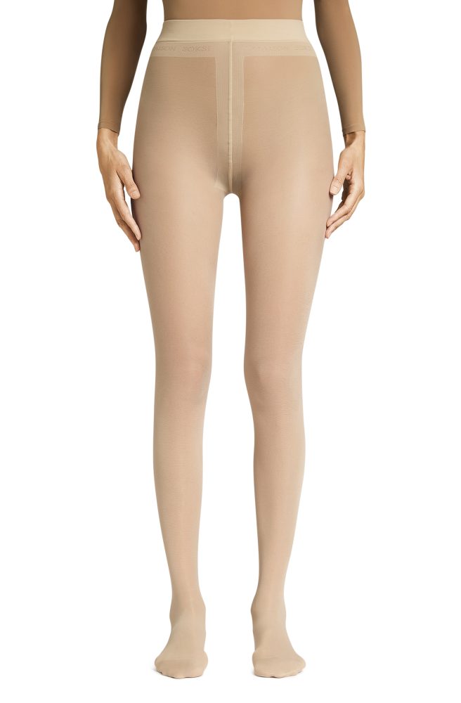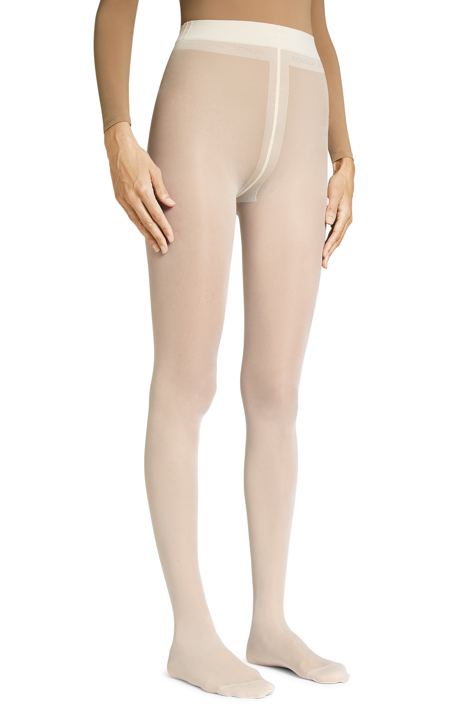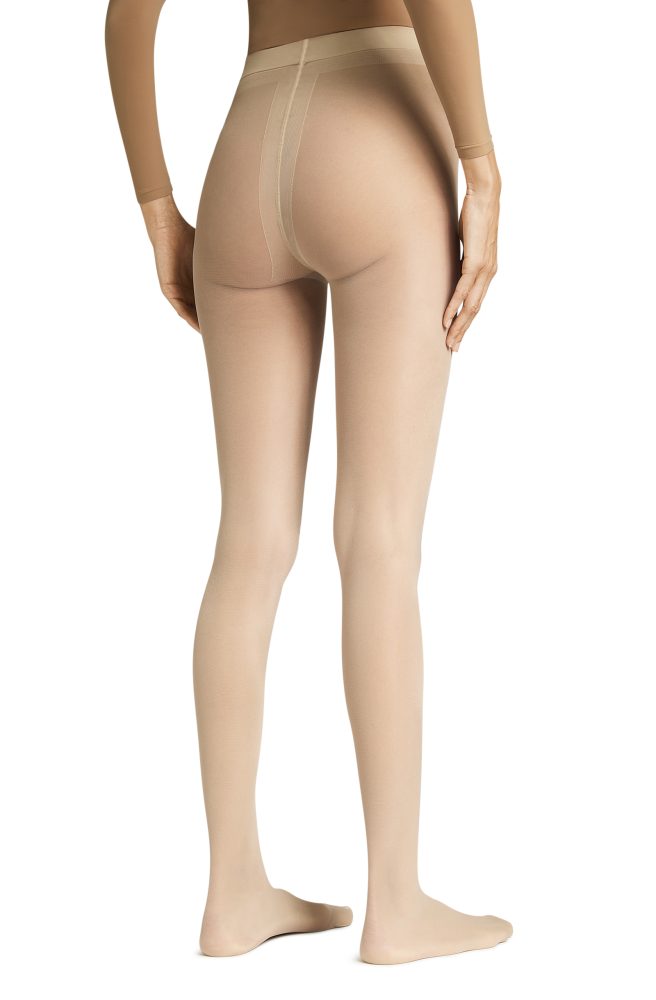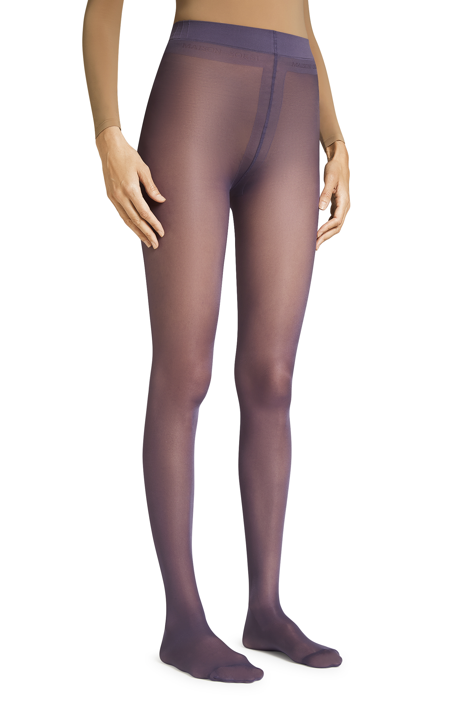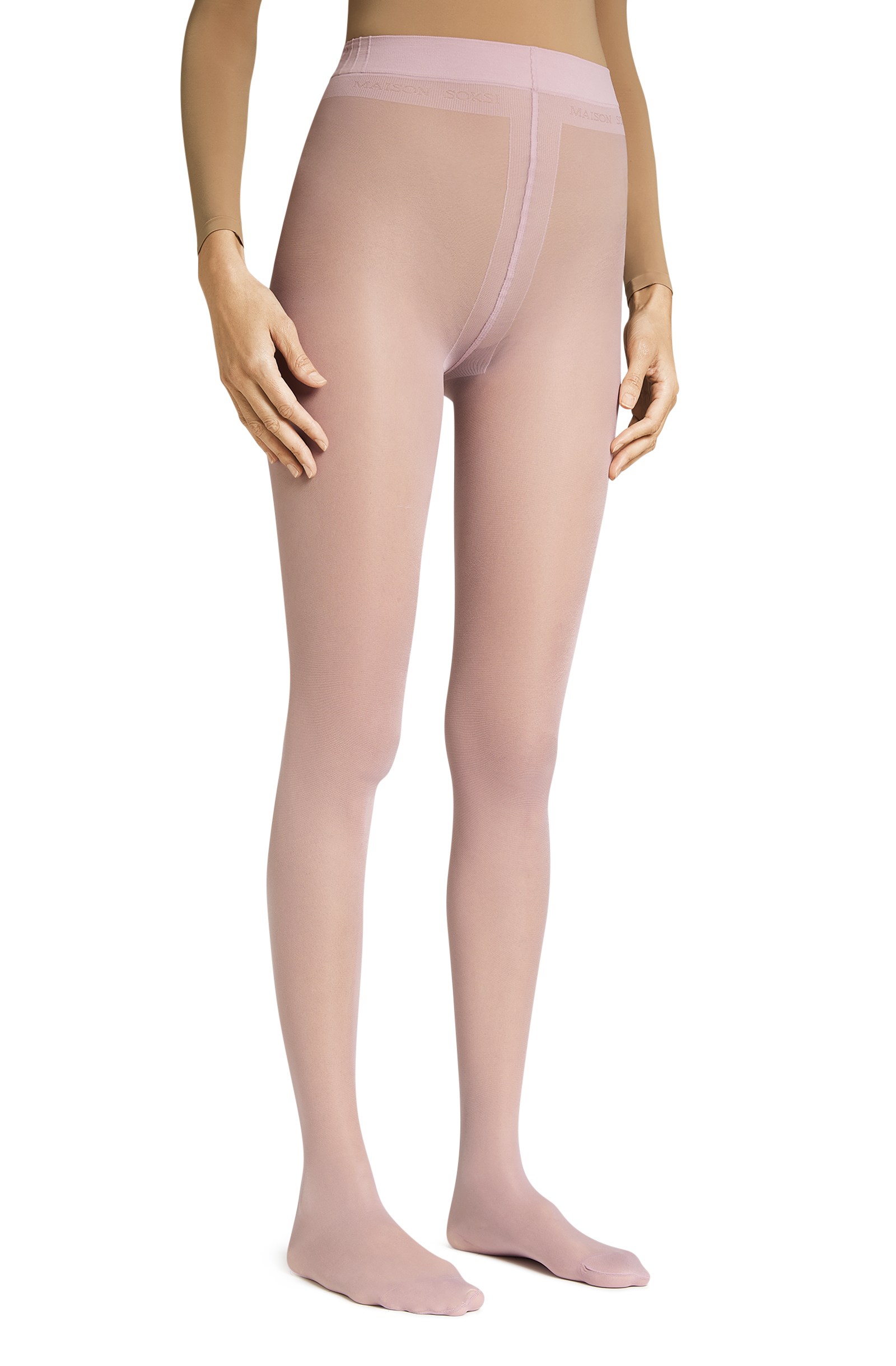 30 den, double covered, tone-on-tone, flat seam, no gusset, fully boarded. Logo knitted under the elasticized waistband. Made in Italy.