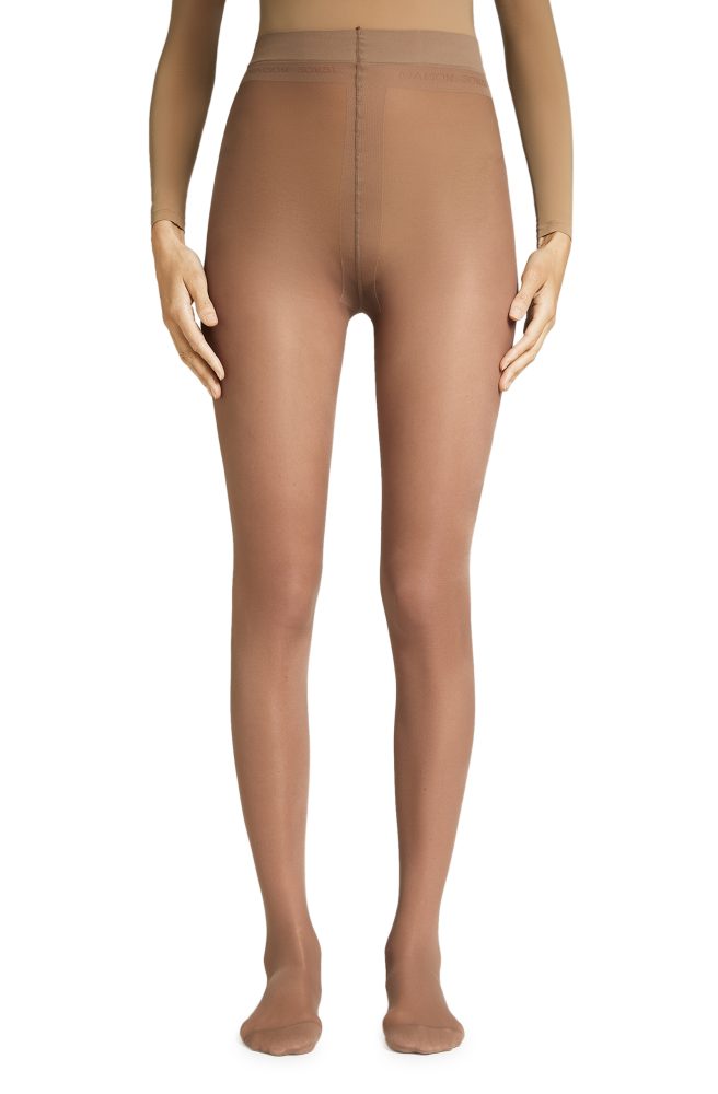 30 den, double covered, tone-on-tone, flat seam, no gusset, fully boarded. Logo knitted under the elasticized waistband. Made in Italy.