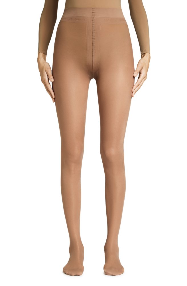 30 den, double covered, tone-on-tone, flat seam, no gusset, fully boarded. Logo knitted under the elasticized waistband. Made in Italy.