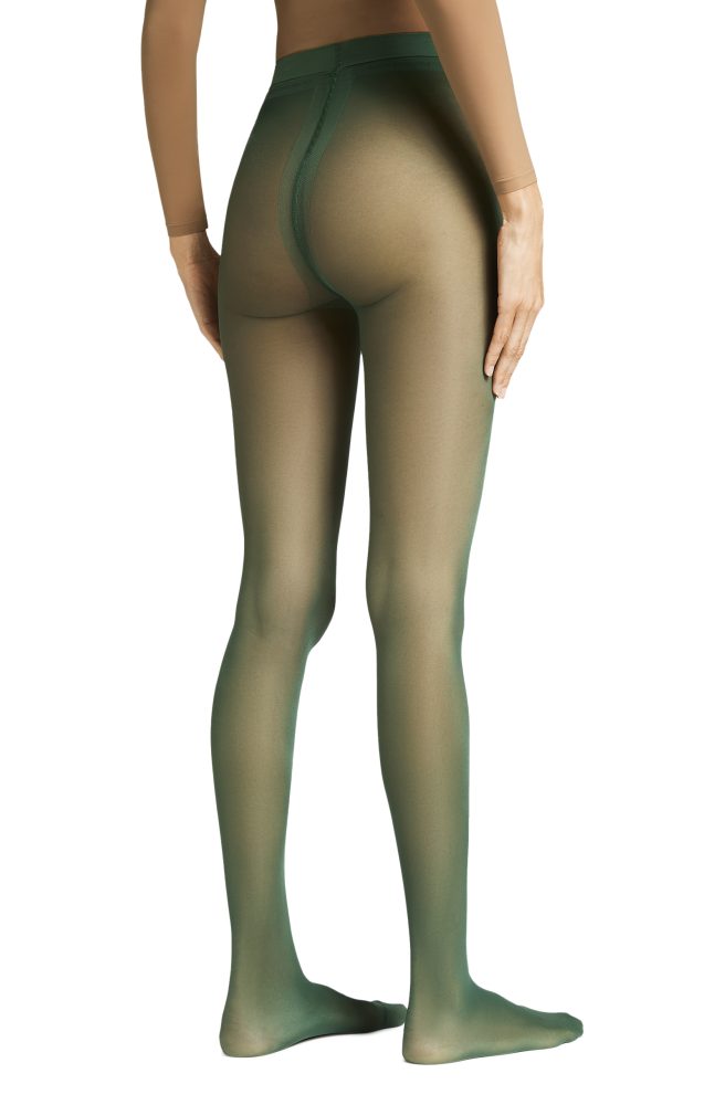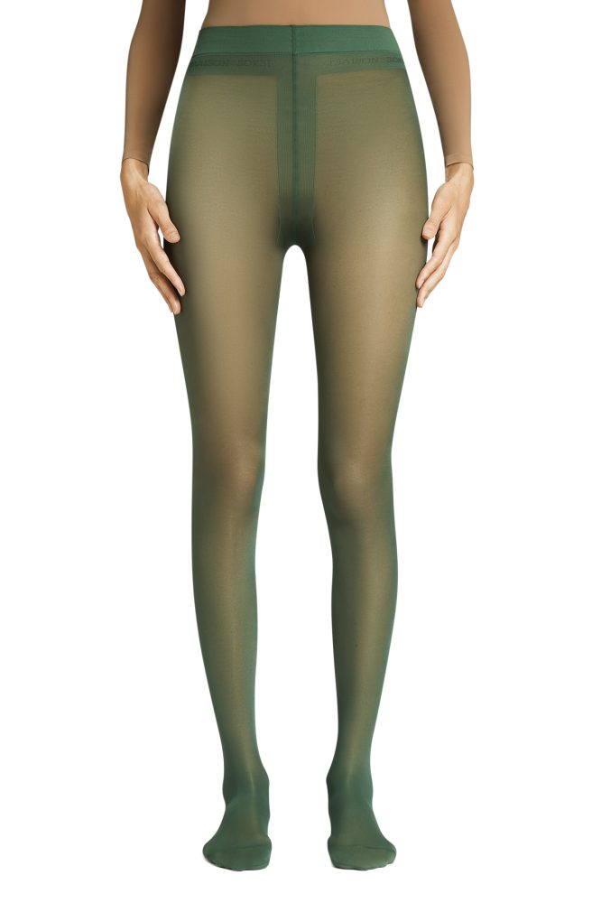 30 den, double covered, tone-on-tone, flat seam, no gusset, fully boarded. Logo knitted under the elasticized waistband. Made in Italy.