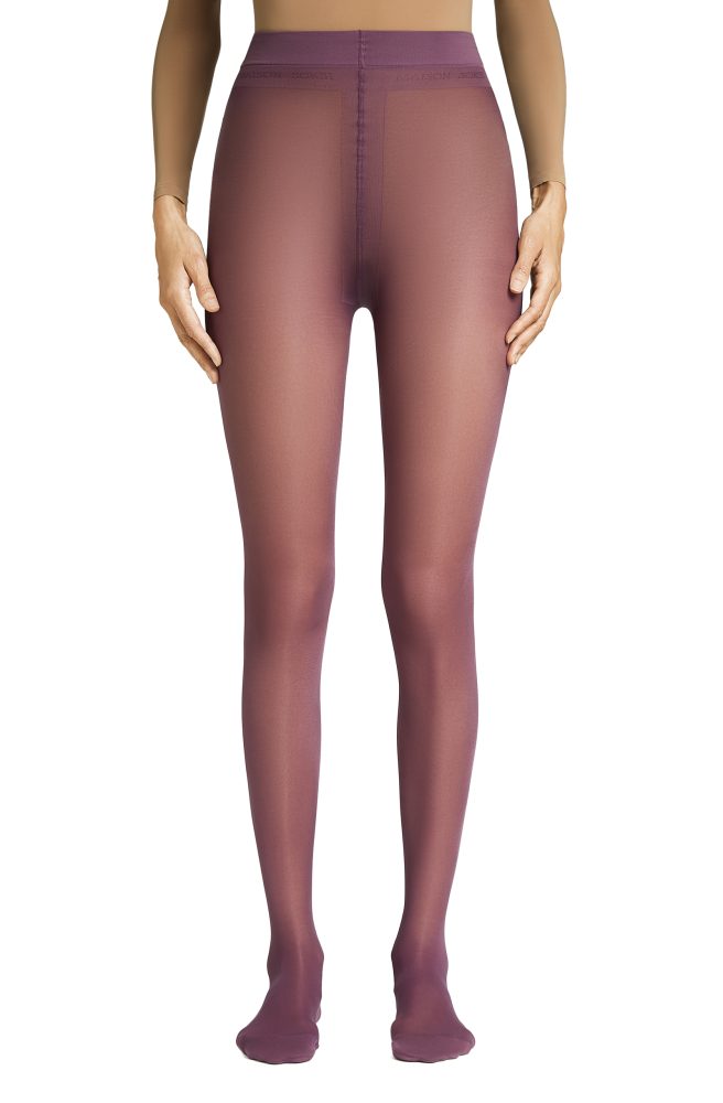 30 den, double covered, tone-on-tone, flat seam, no gusset, fully boarded. Logo knitted under the elasticized waistband. Made in Italy.