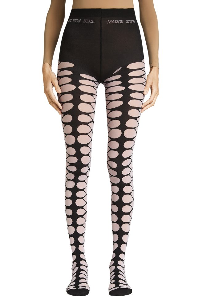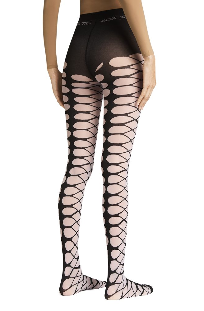 30 den, double covered, bicolor, flat seam, no gusset, fully boarded. Logo knitted under the elasticized waistband. Made in Italy.