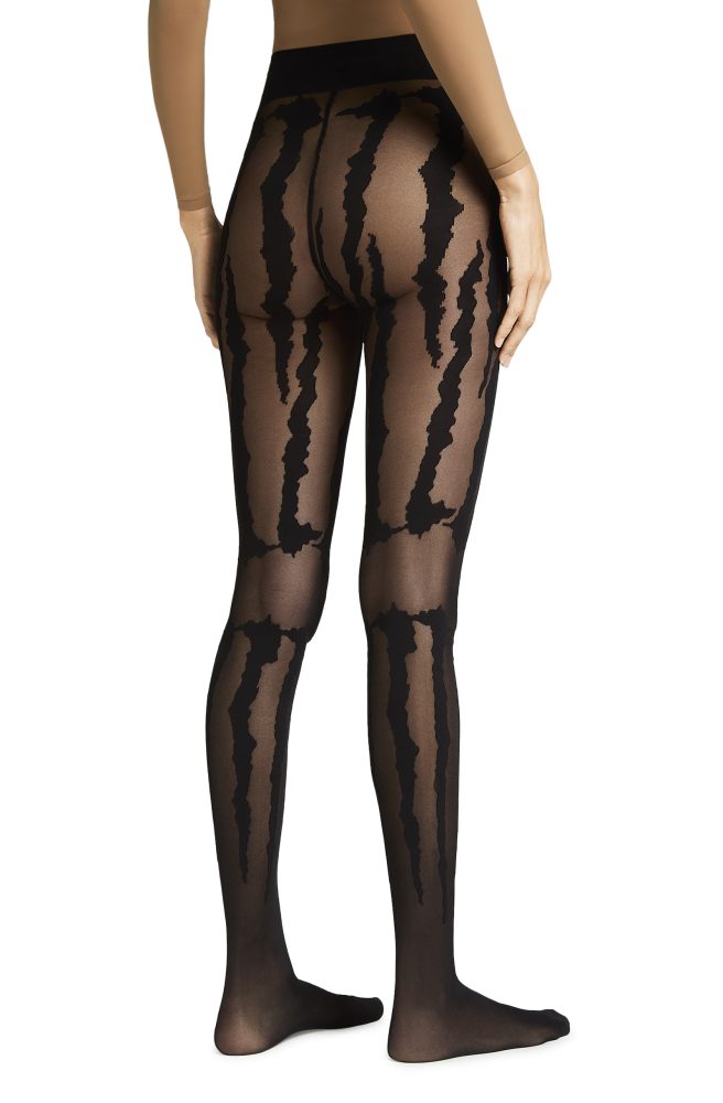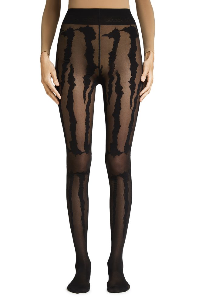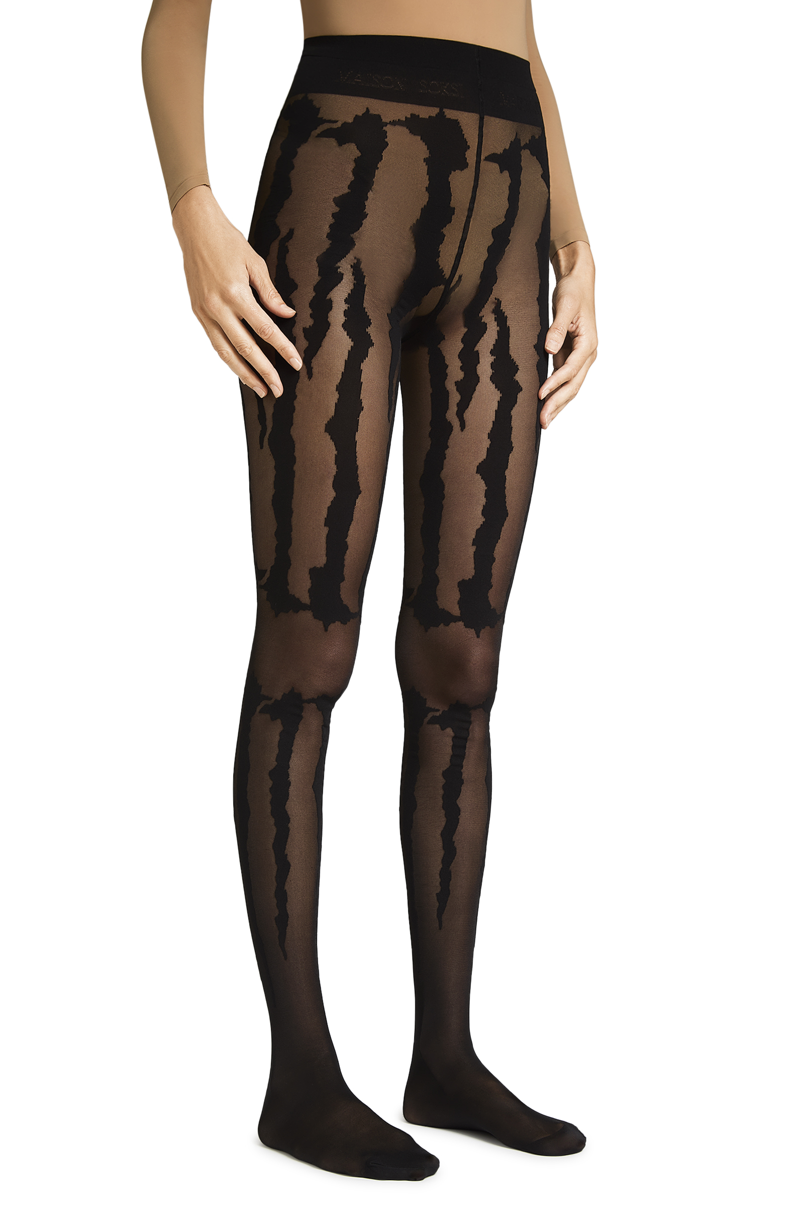 30 den, double covered, tone-on-tone, flat seam, no gusset, fully boarded. Logo knitted under the elasticized waistband. Made in Italy.
