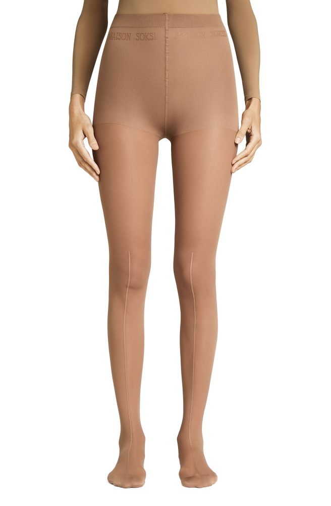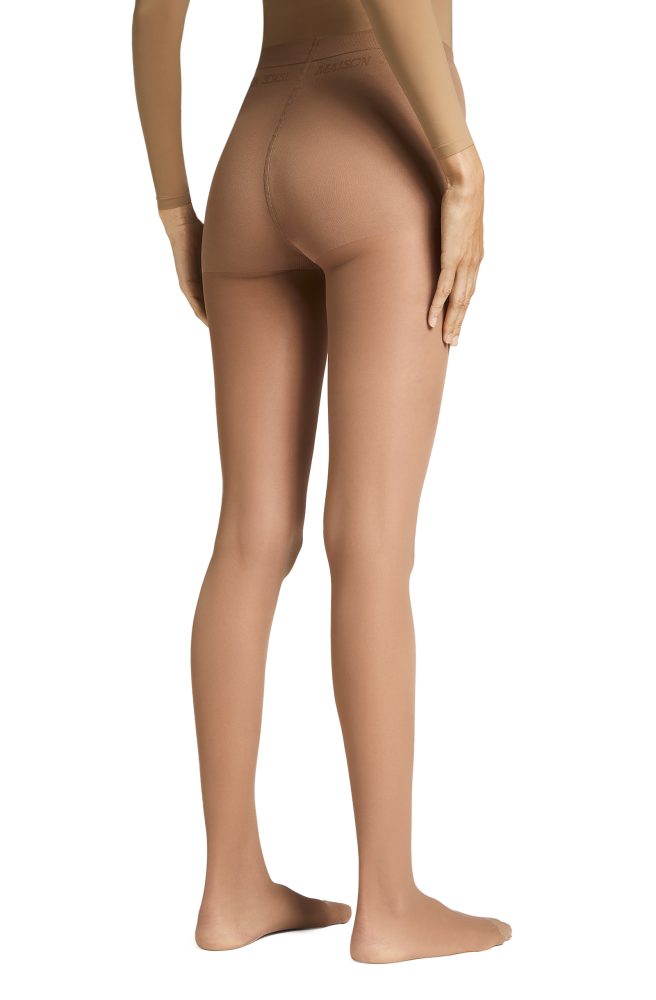 30 den, double covered, deeping, flat seam, no gusset, fully boarded. Logo knitted under the elasticized waistband. Made in Italy.
