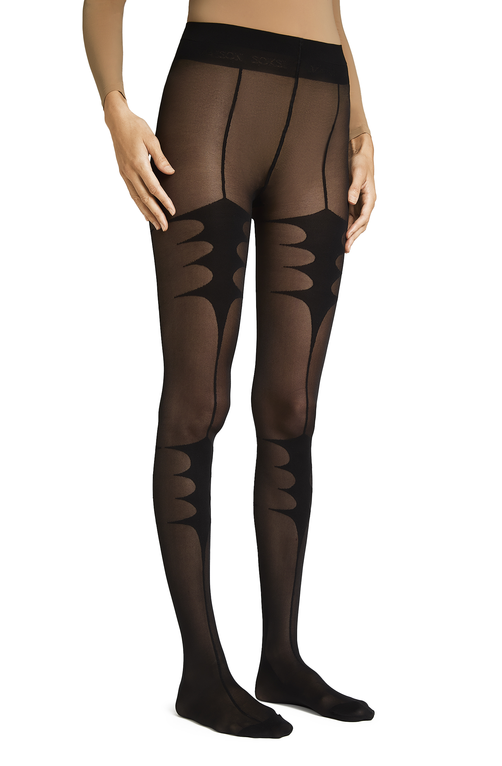 30 den, double covered, deeping, flat seam, no gusset, fully boarded. Logo knitted under the elasticized waistband. Made in Italy.